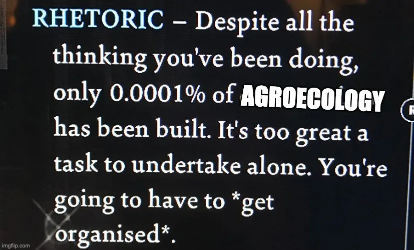 Building our alternatives was at one point seen as the objective of agroecology, and the theory of change being that adding up all of this would lead to systemic change. It hasn’t worked. Instead we are stuck in a global conjuncture of genocide and ecocide, with things like the collapse of AMOC becoming increasingly more likely. The goal of agroecology is stop this destruction and build not alternatives but construct an actually-existing alternative world out of the one we find ourselves in in order to replace the one we find ourselves in. A world that is liveable not just for a minority but for everyone. If that is the goal we measure ourselves by and orient ourselves to, how does the movement reconfigure its priorities, strategy and tactics?1